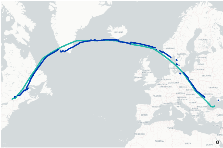 Another example occurred during an April 2024 flight from Delhi to Quebec (pictured above). Early in the flight, AireonVECTOR Flight data and the aircraft’s positional data remained in close agreement. However, after the aircraft entered airspace over the Black Sea/Baltic regions, Aireon’s IPC algorithm triggered a potential spoofing event.