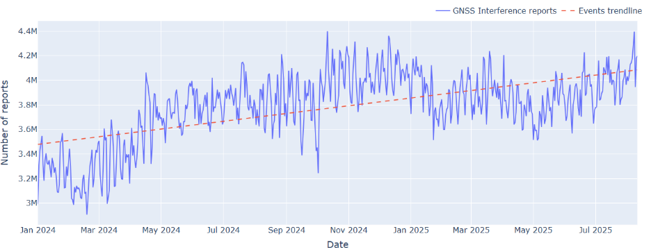 Between January 2024 and July 2025, Aireon observed a steady rise in GNSS interference activity across all regions; the above graph illustrates this trend. The blue line shows the daily number of events detected by Aireon’s system and the red line shows the increasing trend. This increase is persistent, signaling that GNSS spoofing and jamming are no longer isolated regional issues, they have become a sustained operational reality for aviation.